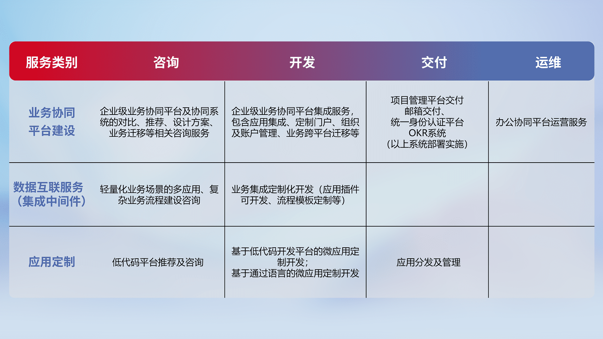 针对钉钉、、企微、、IDaas等平台级产品提供产品的规划、、方案、、交付、、、、定制化开发等服务,,,实现如统一协同办公、、、、智能客户服务、、混合会议管理、、、智能数据查询、、、等业务场景,,,实现数字化转型。。。。