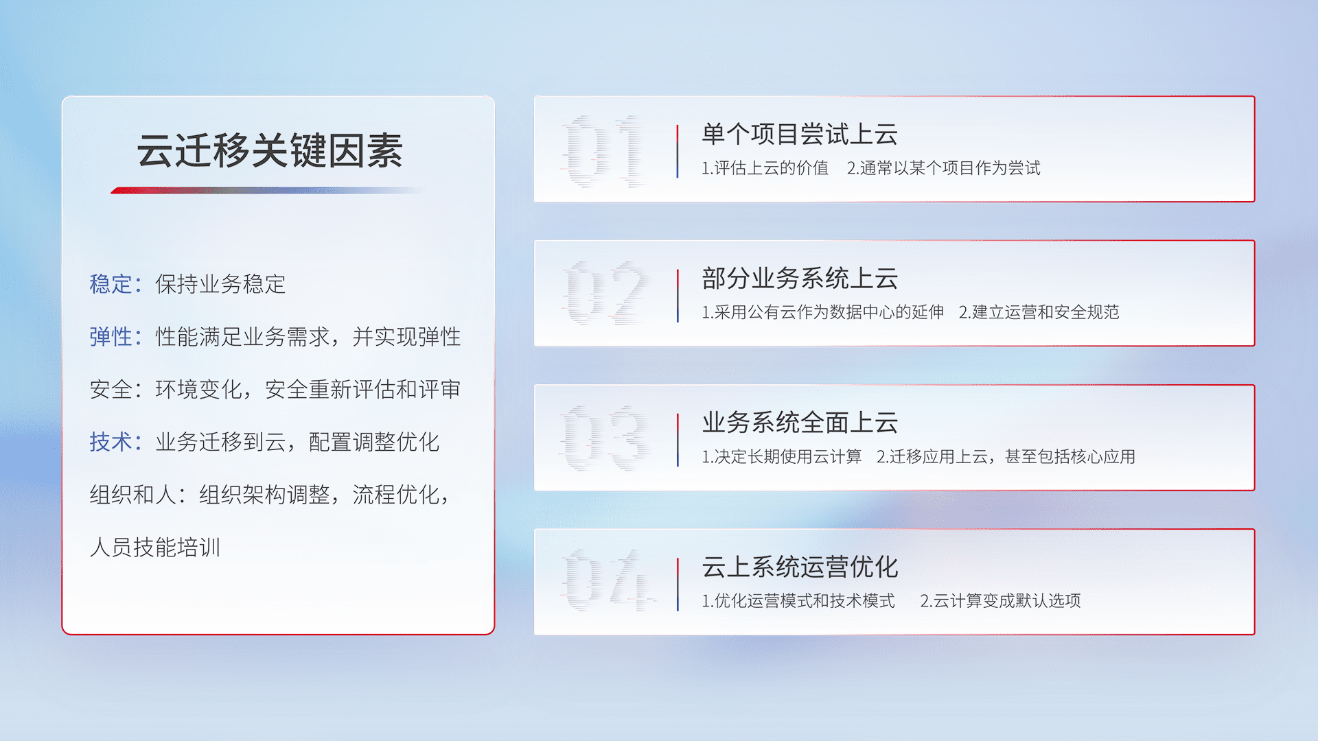 结合实际业务,,从规划设计、、云平台选型、、云原生改造、、、数据迁移、、、、集成交付,,,迁移全过程为客户识别最佳上云路径,,,做好风险识别管理,,设计网络架构、、、、身份权限、、、、安全审计合规、、操作审计、、、、日志审计、、监控告警策略、、、多站点容灾设计等,,对云上基础设施进行整体规划,,提升IT治理水平,,,以满足弹性、、高可用、、、高性能的需求。。