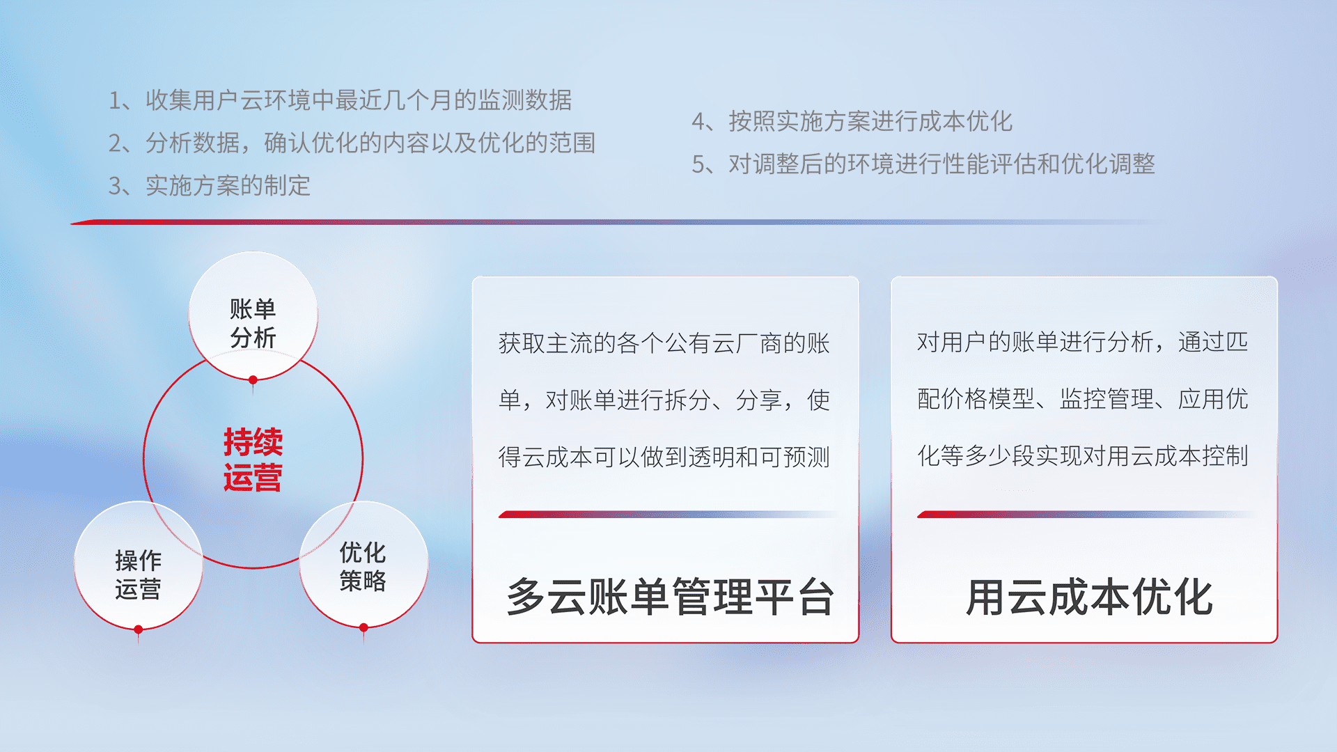 通过多云纳管,,以统一的资源数据模型把客户的云资源进行抽象和封装,,进而实现对多云资源的统一操作,,,,保障云资源管理的可靠性、、、、稳定性与可用性。。。量身定制化运维内容,,配置、、、、开发运维、、补丁管理、、备份、、监控、、认证和访问管理、、审计和日常巡检等,,,保障在用云过程中的可靠度,,,稳定度以及高可用率。。。。